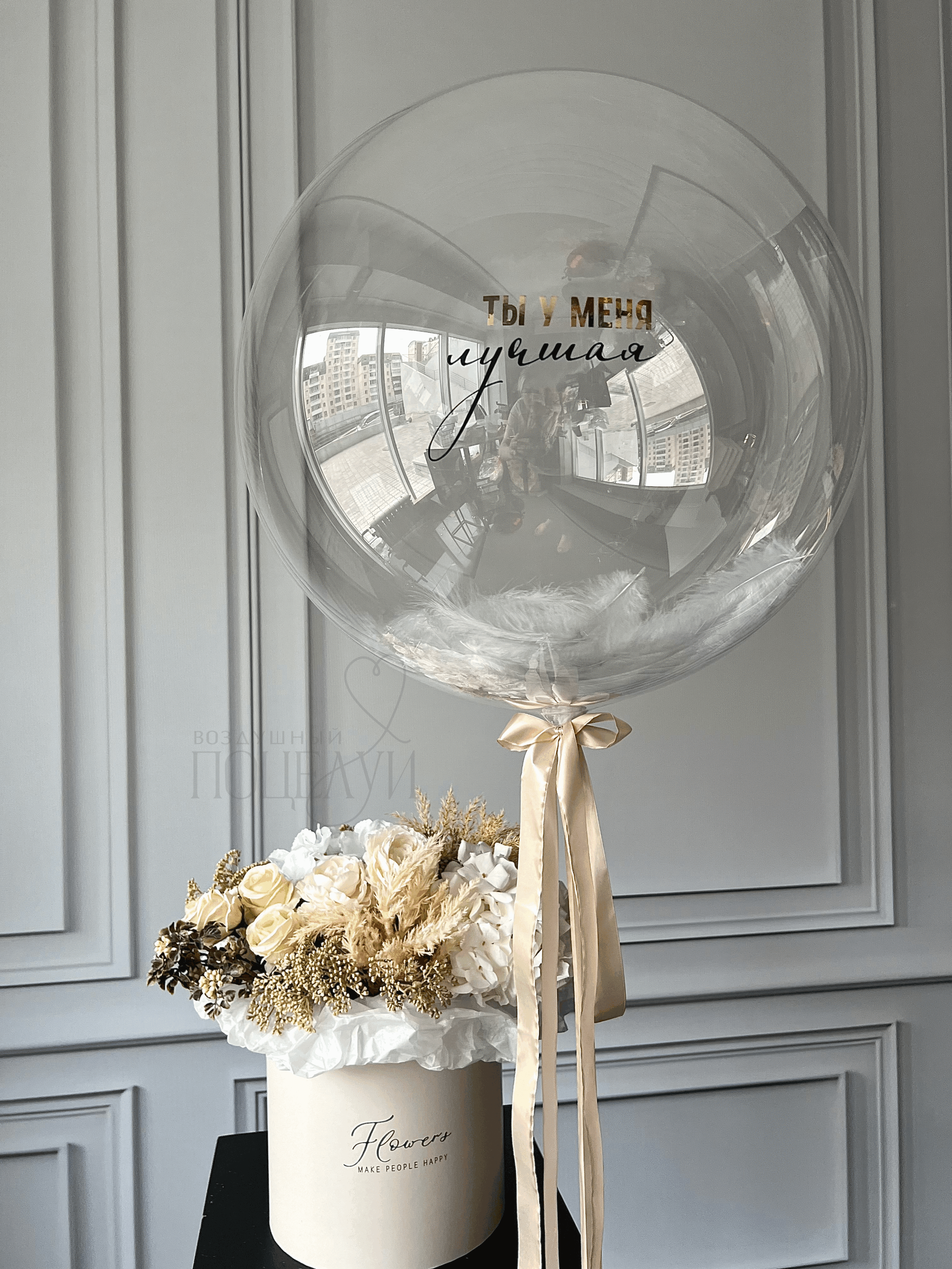 Большой прозрачный шар (60 см) с надписью и перьями