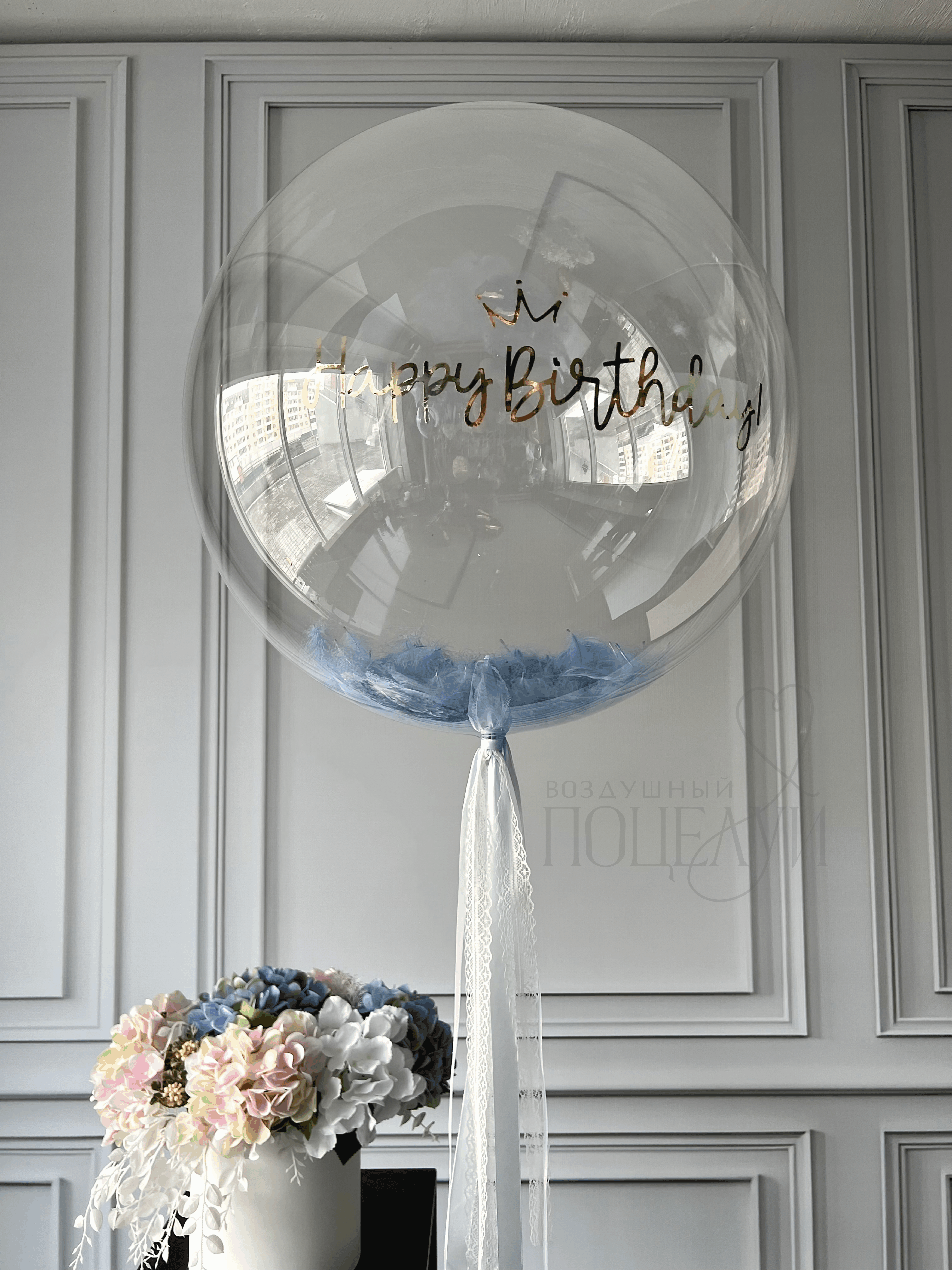 Большой прозрачный шар с надписью и перьями (60 см)
