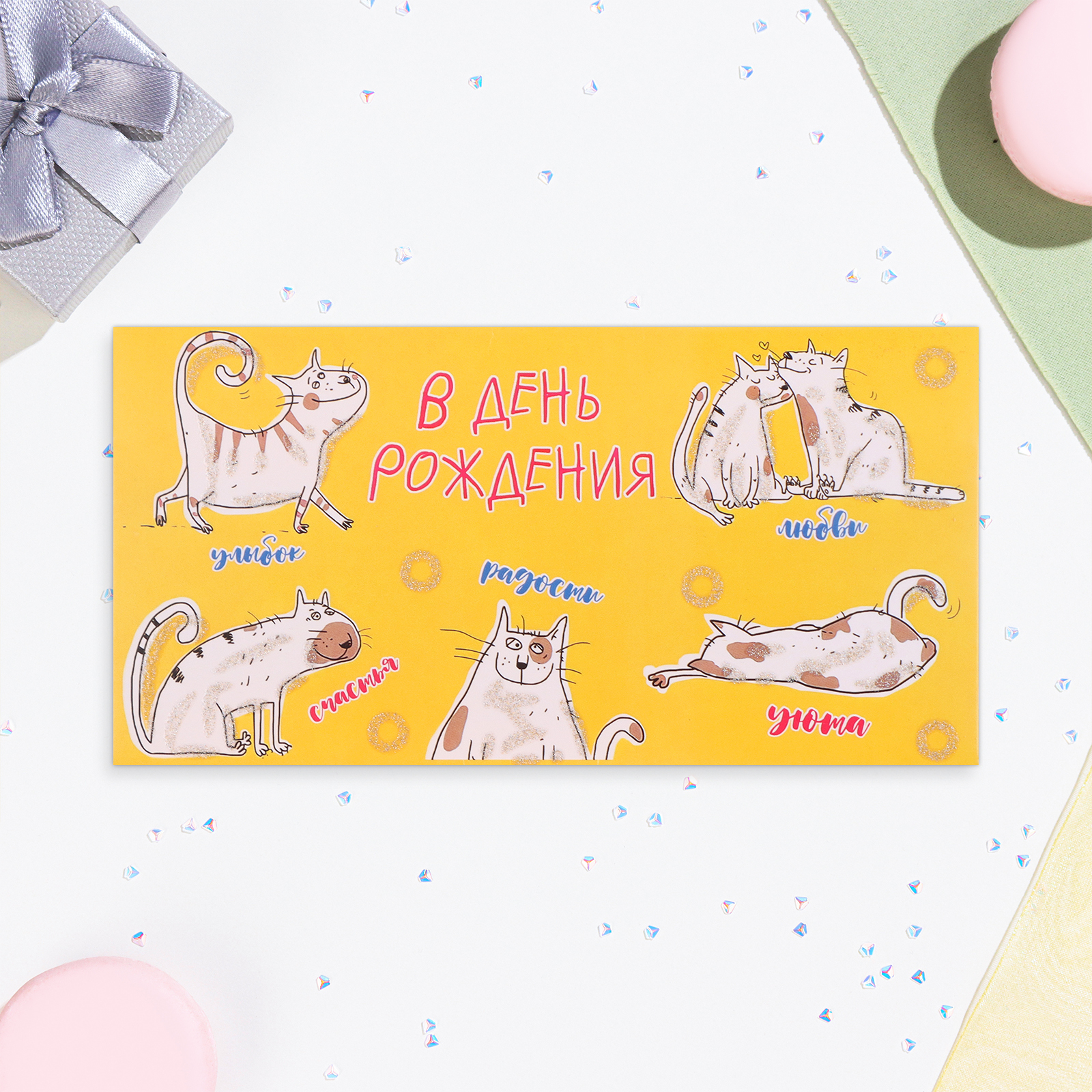 Конверт для денег "В День Рождения!" пожелания от кота, 17 х 9 см