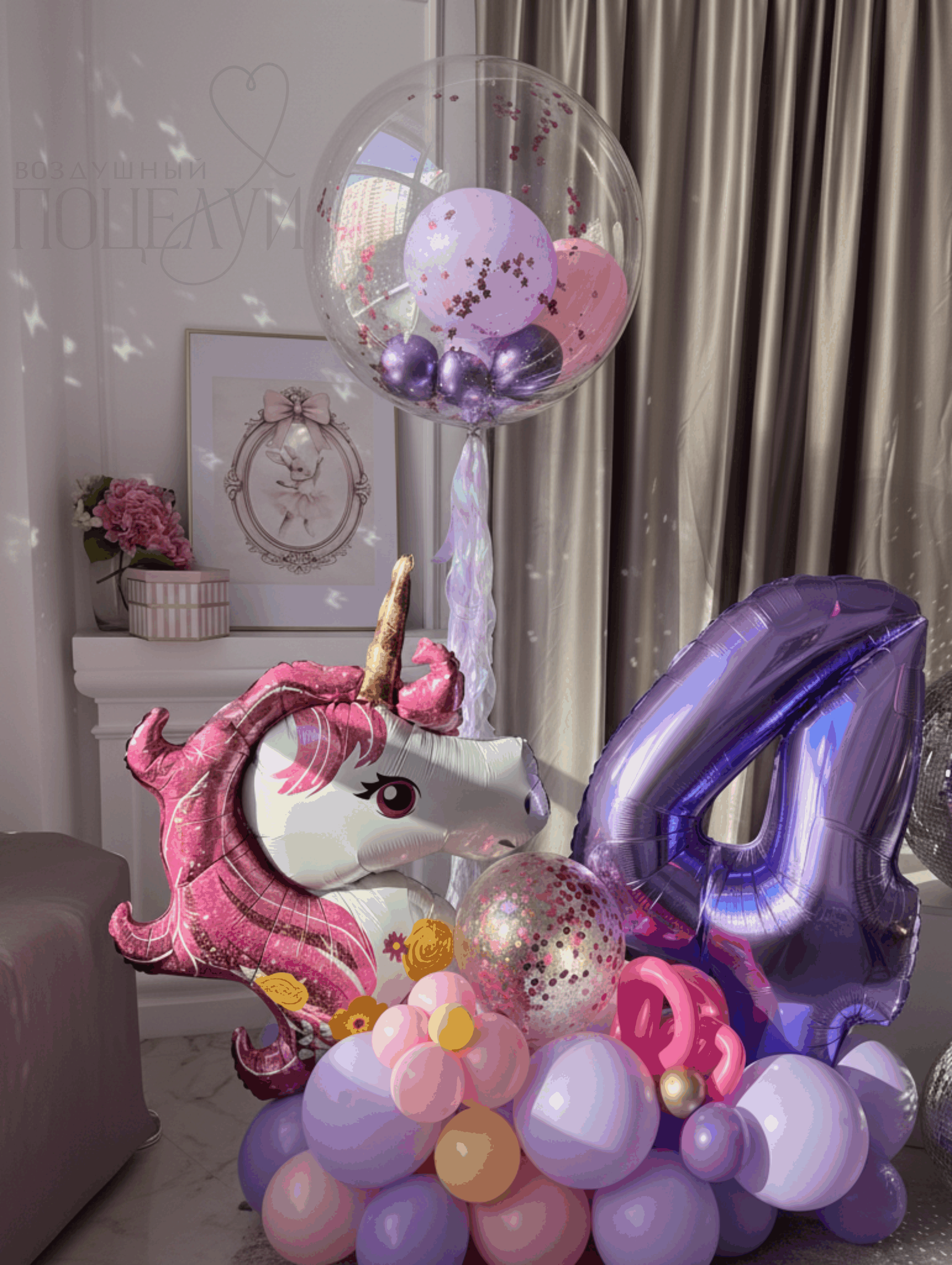 Основание: Шар 12" (30 см) "Сиреневый макарунс", 5" (12 см) "Золото хром", 12" (30 см) "Кристалл"+ конфетти, ШДМ "Фуксия".