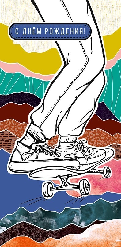 Открытка-конверт, "С Днем Рождения", Скейт, 8*17 см