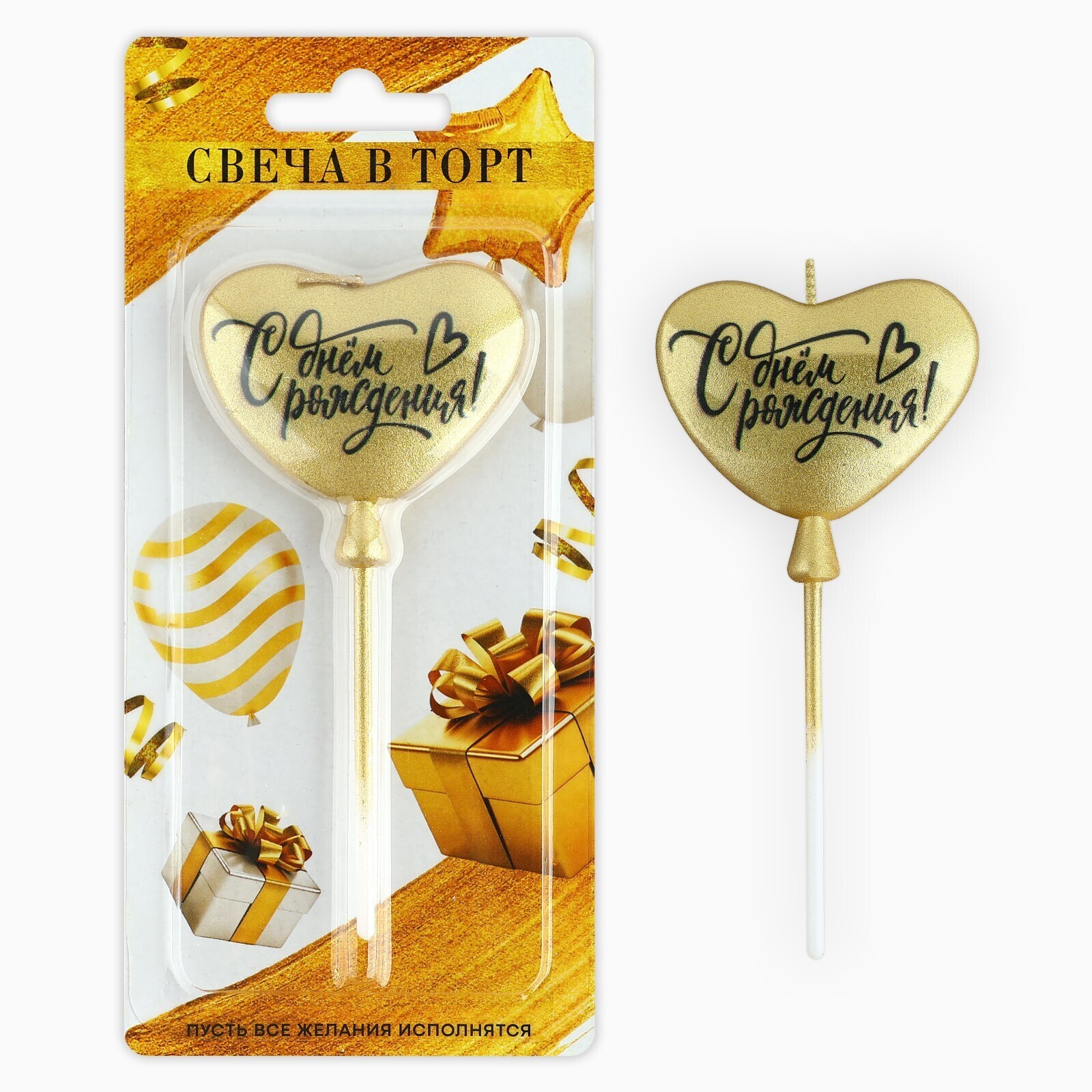 Свеча, Сердце на шпажке «С днем рождения», Золото, 5,5*12 см, 1 шт.